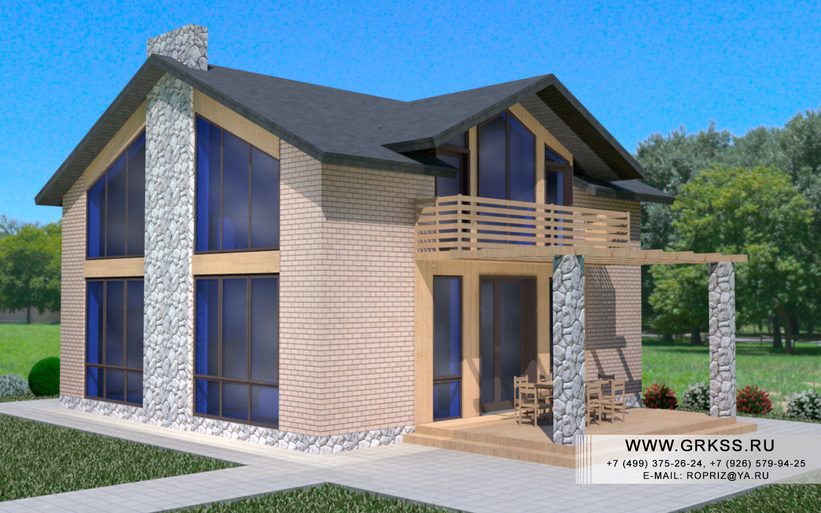 Проект "полуторно-этажного" дома под условным названием "Просторный". Интересный проект, имеющий большую общую площадь, четыре спальни, совмещенные зоны кухни и гостиной общей площадью 42 квадратных метра. Пример приведенного в проекте цветового решения остекления данного дома, в нашем случае синий оттенок окон, не оставит этот дом не замеченным на фоне остальных домов. Так же в проекте имеется балкон, устроенный под общей крышей представленного проекта и не маленькая по размеру терраса.