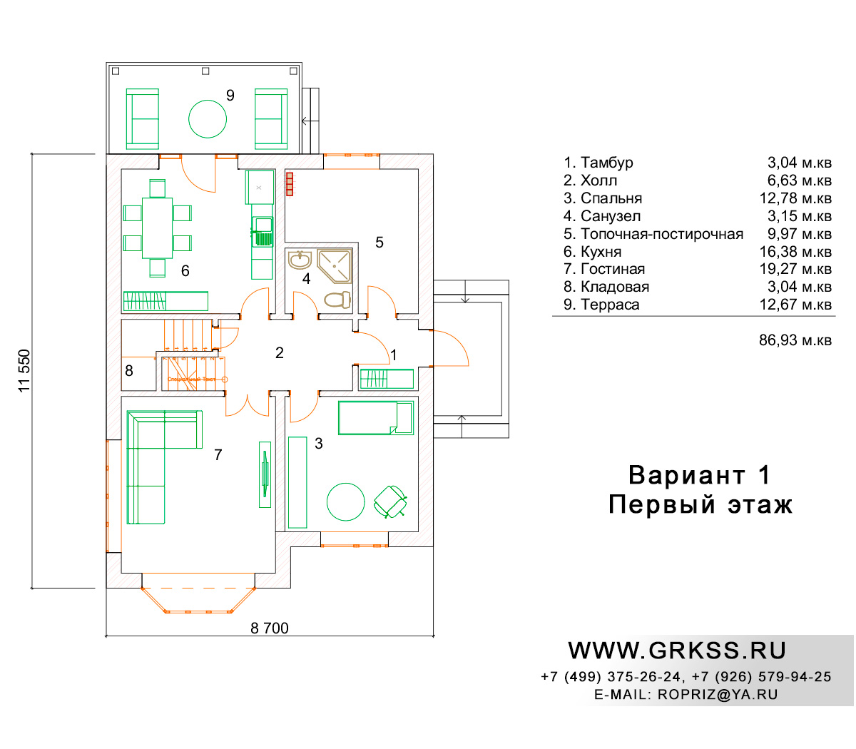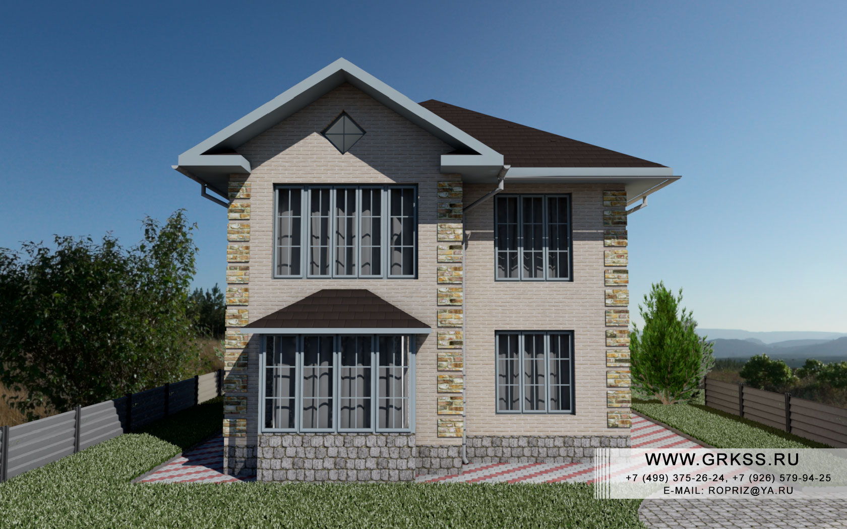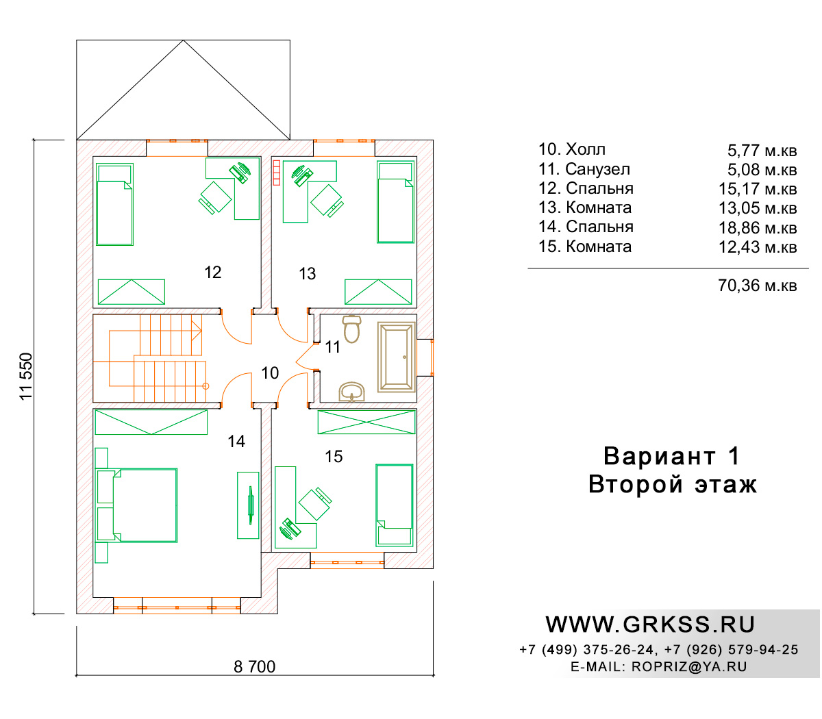 Проект двух этажного дома с условным названием "Тибр". Полноценный двух этажный дом. Относительно не большой по площади, около 157 метров квадратных, но вместивший в себя все необходимое: два санузла, спальную комнату на первом этаже, гостиную и террасу. Рассматриваемый дом подойдет для застройки небольшого земельного участка, длина стен дома составляет 11,5 и 8,7 метра. В данном проекте совмещены зоны так называемого топочного помещения и зоны для устройства стиральной машины. Для этих целей в проекте имеется помещение площадью почти 10 метров квадратных. При своих относительно не больших размерах дом имеет 5 спален, а значит позволит принимать гостей и с комфортом располагать их после приема.