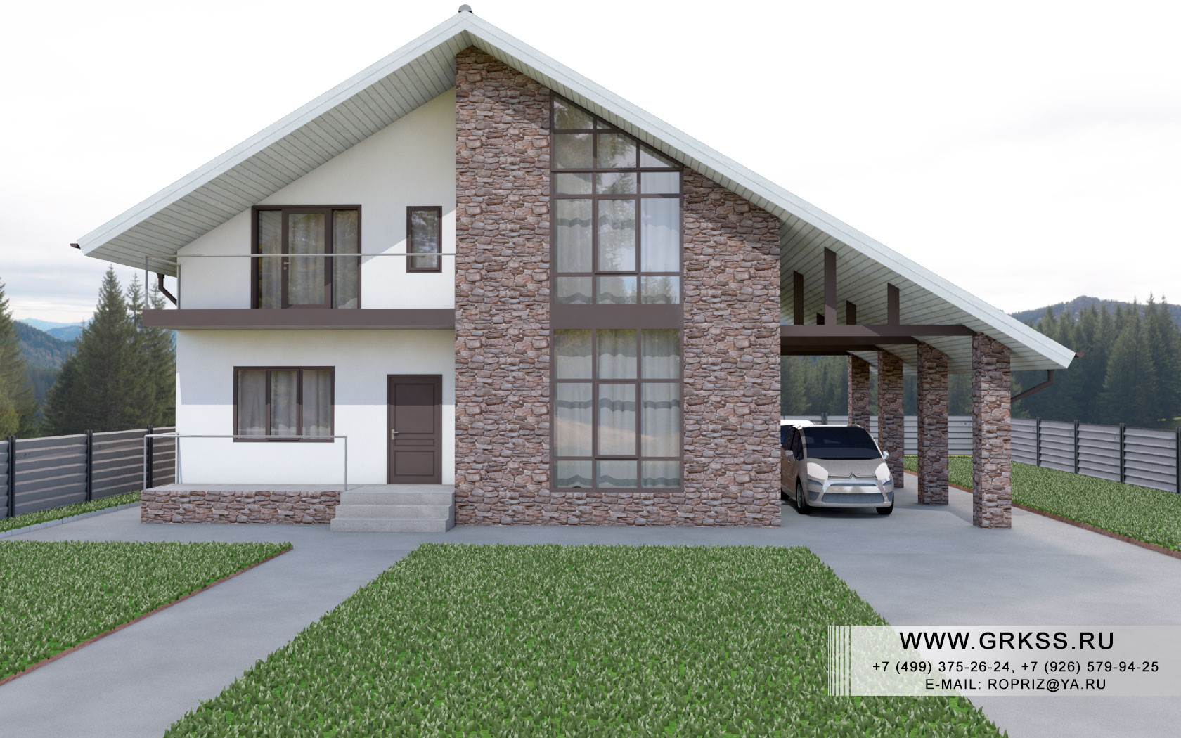 Проект "полуторно этажного" дома с условным названием "Европа". Пять спален, большая кухня, изолированная гостиная, терраса и балкон. Интересный проект, с необычным, запоминающимся наружным дизайном. Не стандартным решением явилась общая крыша, которая в продолжении выполняет функцию навеса, под которым можно спрятать два автомобиля. 225 метров квадратных данного великолепного дома понравятся всем в нем побывавшим или его увидившим.