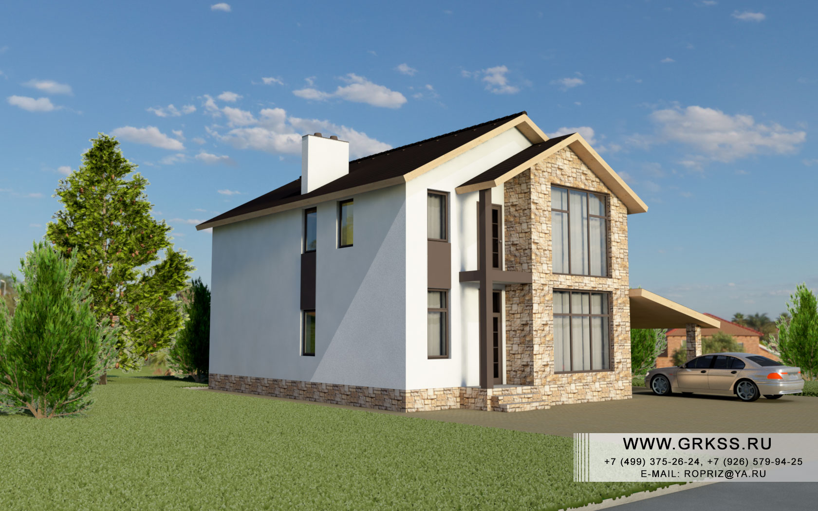 Проект "полуторно-этажного дома" с условным названием "Ультиматум". Функциональный, просторный дом, как говорится "на все случаи жизни". Просторные спальни площадью около 20 метров квадратных, огромнейшая кухня-гостиная, гардероб на втором этаже, в общем все что нужно, для комфортного проживания в любое время года, будь то за городом или в городе. Панорамные окна фасада, навес для автомобиля, интересный вариант для любых задач.