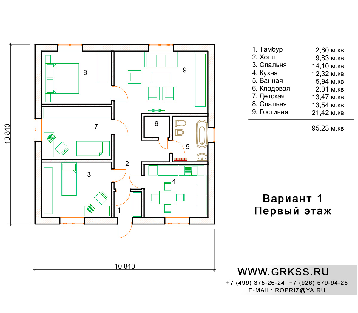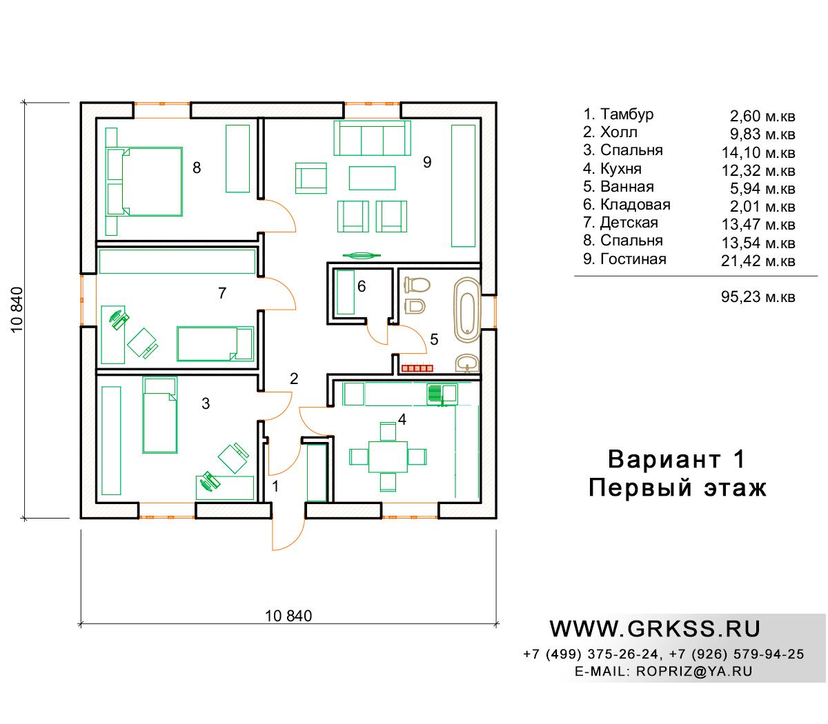 Рассматриваемый проект одноэтажного дома общей площадью 95, 23 метра квадратных. Данный проект заинтересует семью из 3-4 человек, станет прекрасной альтернативой проживания в квартире. Данный проект имеет одинаковые по размеру стены, длинна каждой составляет 10,84 метра. Планировка, а так же возможные изменеиия по желанию Заказчика, в этом, а равно и в любом другом нашем проекте, интересная для нас тема к обсуждению.