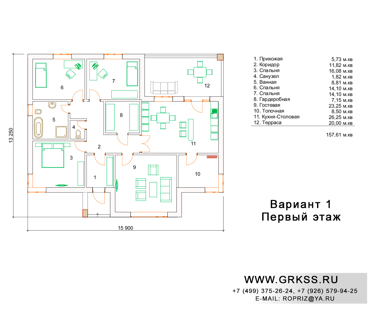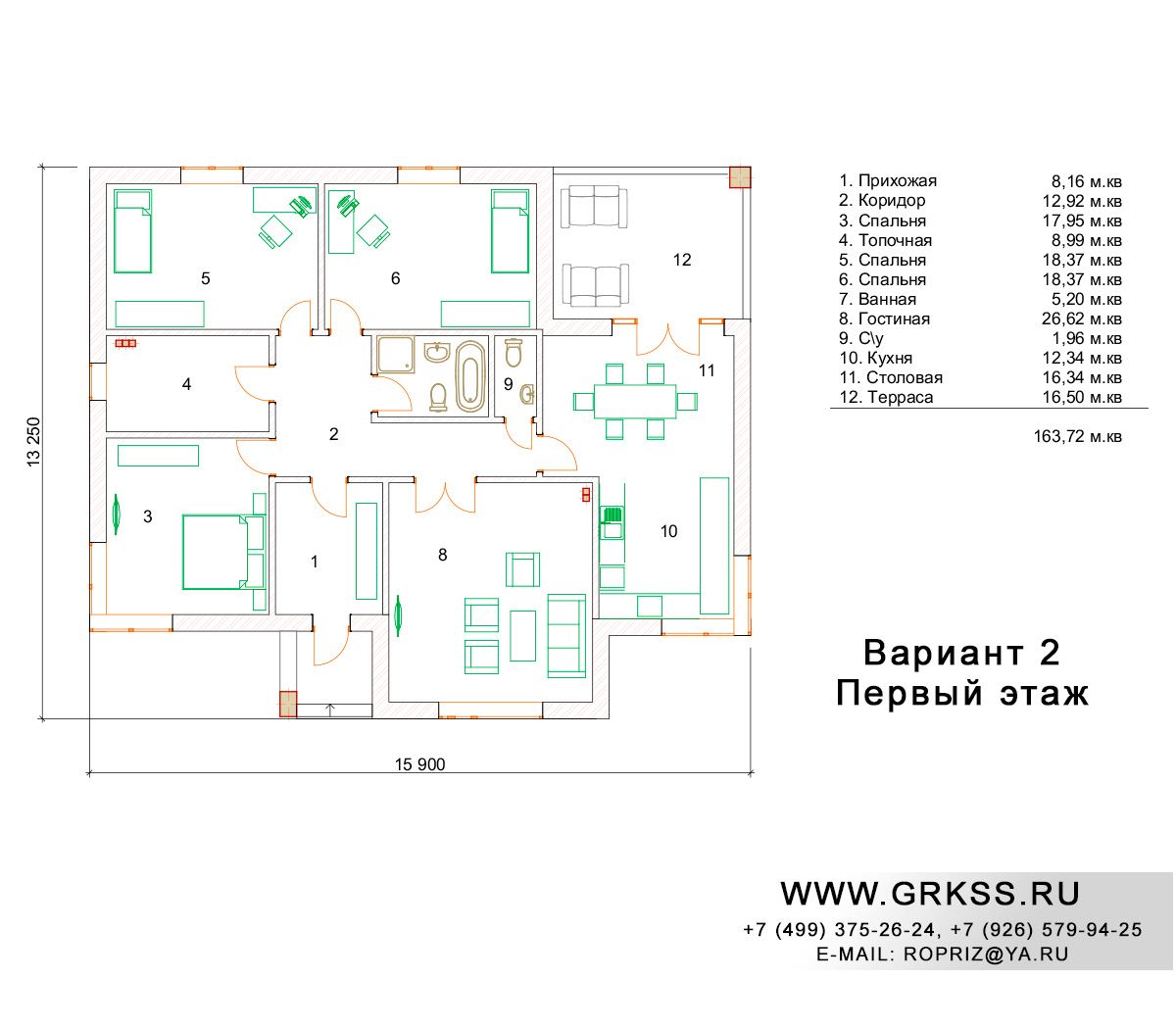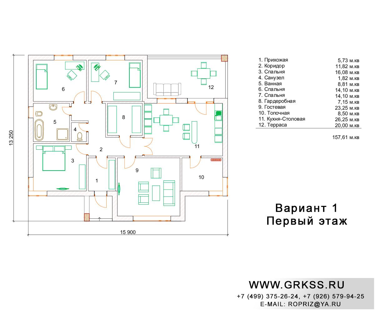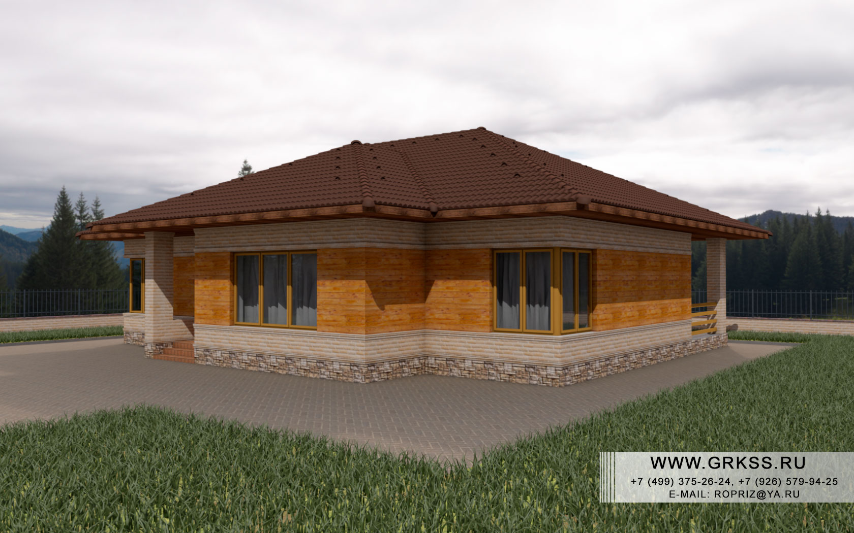 Описание: Проект дома "Этар" это просторный, одноэтажный дом. В проекте данного дома предусмотрены три спальни и отдельно расположенная изолированная гостиная, так же проектом учтено устройство просторной террасы площадью от 16 до 20 метров квадратных, в зависимости от выбранной планировки. Варианты использования материалов стен данного дома, как и любые другие материалы использование которых возможно, при постройке данного дома, зависти от Ваших пожеланий и представлений об уюте и комфорте. Данный проект как и любой другой, мы готовы выполнить как из камня, так и из дерева.