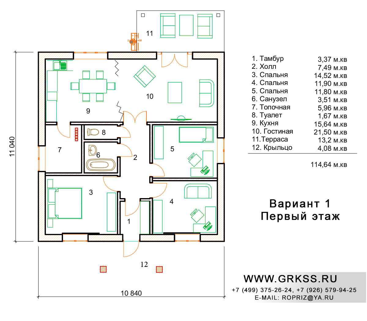 Проект данного дома представляет собой сочетание комфорта, уюта и надежности. Данный проект имеет размер - 11,04х10,84 м., общей площадью 114,64 метра квадратных. Дом оптимально подойдет для проживания 3-5 человек, в зависимости от возраста и пола. В рассчетах проекта данного дома заложены долговечные материалы, стены дома спроектировны из камня. Совокупность вышеописанных свойств предлагаемого проекта удовлетворит требованиям самого притязательного клиента и не оставит его равнодушным. Безусловно, данный проект дома является наилучшей альтернативой проживания в квартире. Основным приимуществом этого проекта с учетом его планировки, кончно же явлестя его не высокая стоимость. В любом случае, не зависимо от выбранного варианта, все строительные работы выполняются в четком соответсвии с предьявляемыми нормами и требованиям СНиП, с постоянным контролем каждого из этапов строительсва.