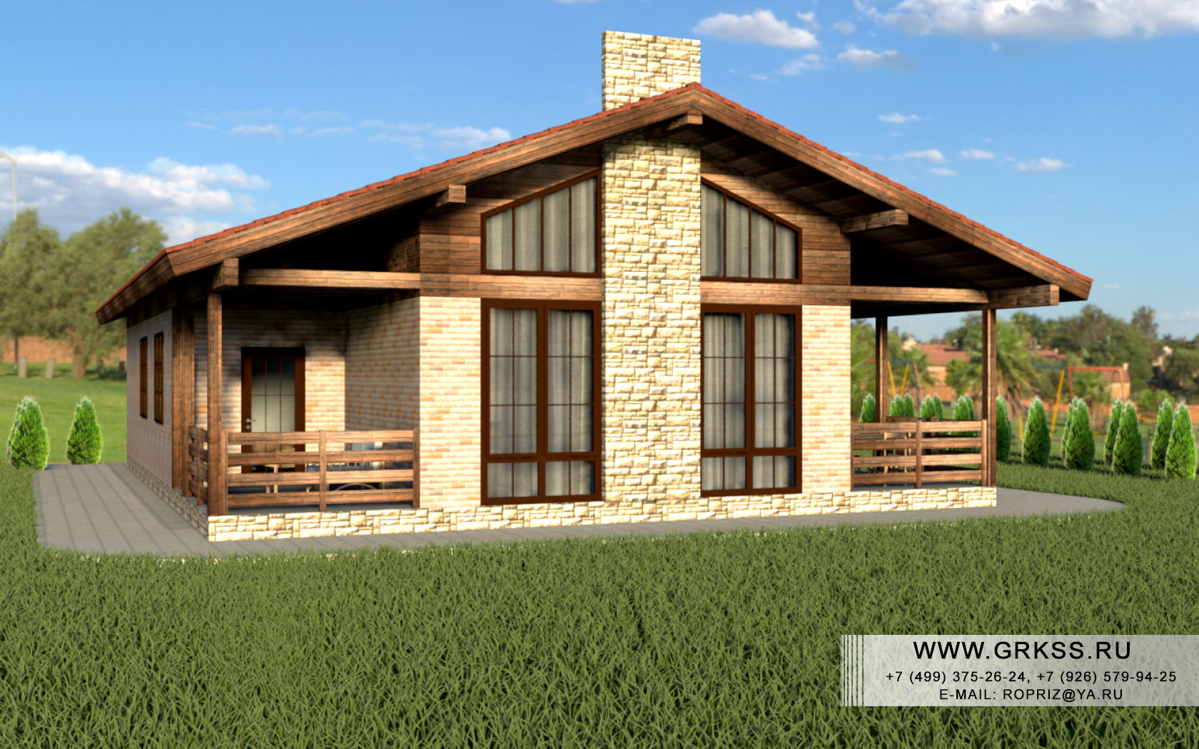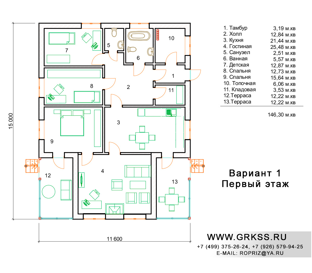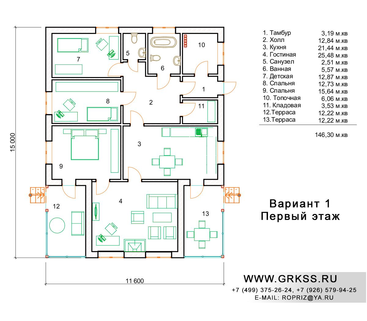 Проект одноэтажного дома с условным названием "Одноэтажное шале". Просторный и функциональный дом, под крышей которого расположилось три спальных комнаты, отдельно устроенная гостиная и конечно же кухня, при чем кухня с выходом на террасу. Вместе с тем, проект так же предусматривает выход на террасу из одной из спален данного дома. Общая площадь данного дома составляет 146 метров квадратных, длина стен 15 и 11,6 метров соответственно. Любые изменения в планировке, внешнем облике, а так же размерах данного проекта, допустимы и возможны.